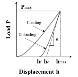 where hmax is the maximum contact depth as is shown in figure above and is a constant dependent on tip geometry which is 0.75 for a Berkovich tip and 0.72 for a conical tip. The indentation stiffness (S) is the slope of the initial portion of the unloading curve as is shown in the figure below.