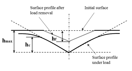 At this stage, it is worthwhile to discuss ways to estimate the contact area (Ac) accurately without the use of microscopy. In this respect, the work of Boussinesq, Hertz, Sneddon, Tabor, Stillwell, Doerner, Nix, Pharr and Oliver has been instrumental in determining Ac as a function of contact depth (hc). The figure below illustrates what we mean by hc.