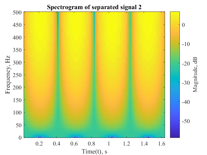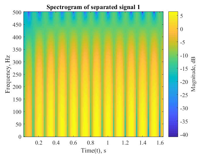 Results obtained from the implementation of the above algorithm for separation of pure sinusoidal mixed signals are shown below. Data is shown in both in terms of amplitude and frequency (spectrogram) versus time for effective comparison.