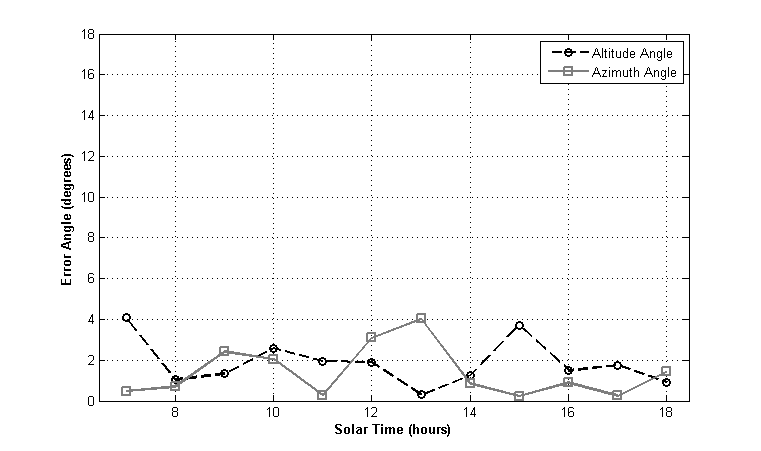 Tracking accuracy of the sensor throughout the day was determined in terms of azimuth and altitude angles and was plotted against solar time (figures below). A comparative analysis of true and observed values versus solar time showed a maximum deviation of ± 4°. The sensor output was also fed to a test panel to visually validate tracking.