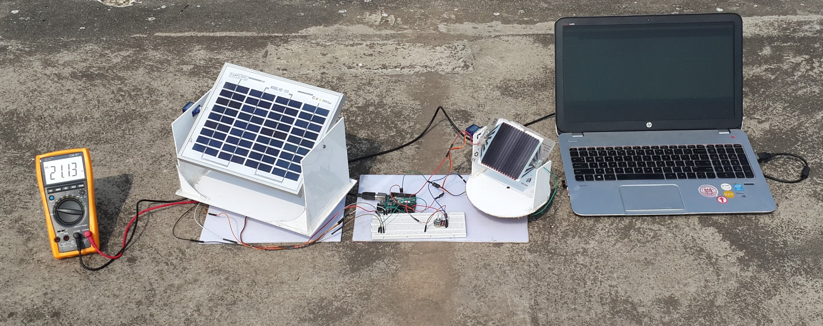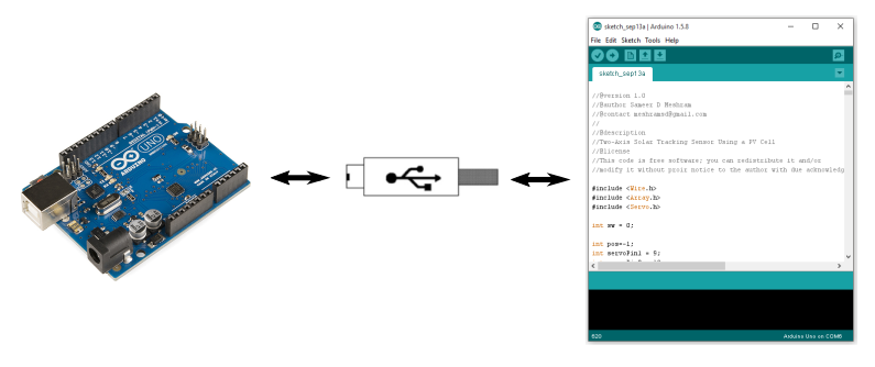 The power required to drive the two servo motors and the microcontroller was taken from a USB port of a PC. It can also be taken from the solar energy produced by the panels to which the sensor caters or any other external direct voltage source.