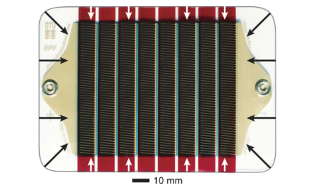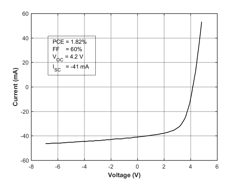 Abundance, fast manufacture, and low cost are what ideally epitomize organic and polymer photovoltaics and is therefore a choice of sensor in this tracking device. These cells are indium-tin oxide (ITO) free and have been shown to exceed 10 000 hours of lifetime under standard outdoor exposure conditions. The normal operation temperature range is from – 80 °C to 120 °C and the sensor used in the prototype weighs around 5 g. The I-V response of the OPV cell and an actual photograph of the cell used in the prototype is shown in the figure below [36].