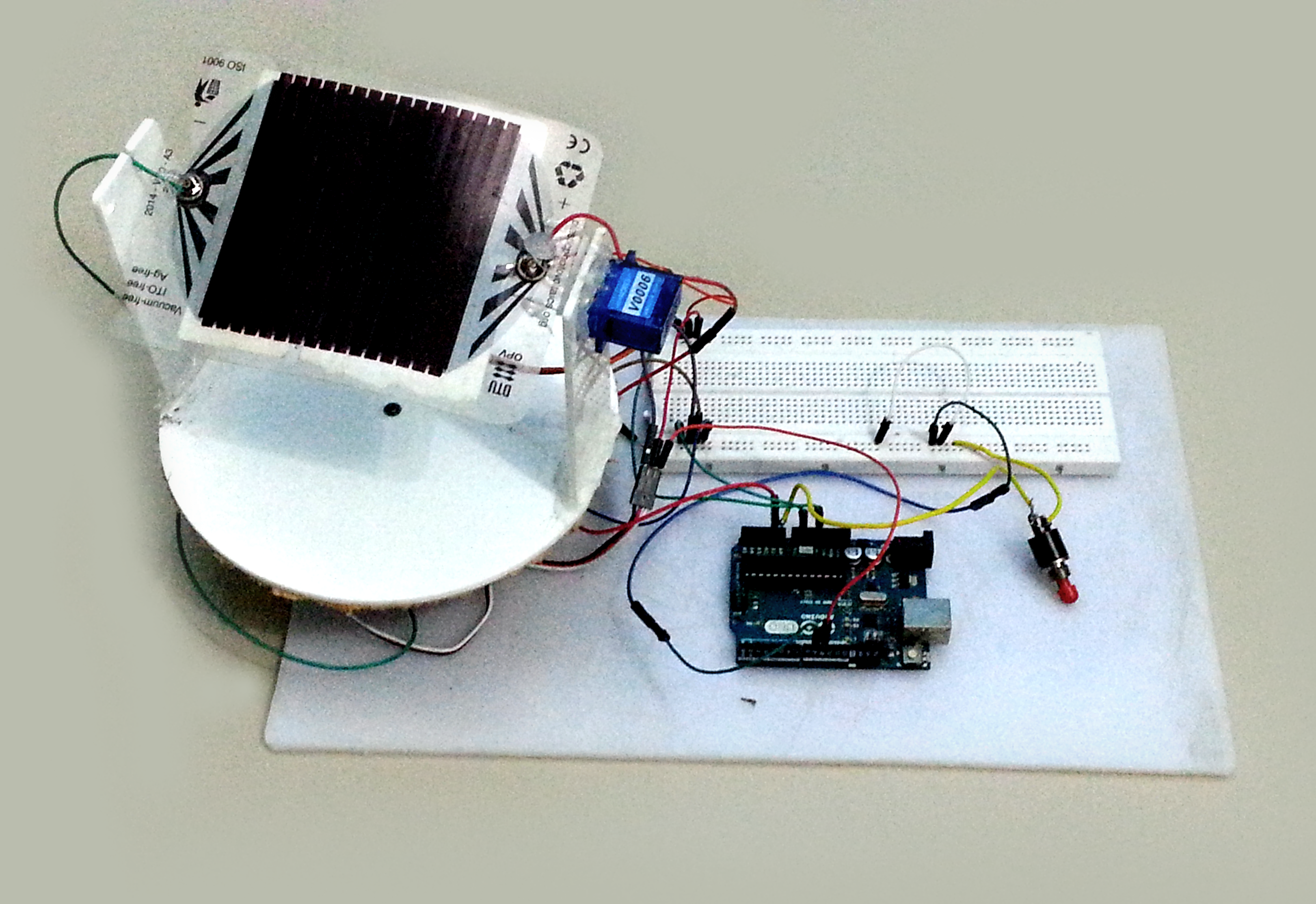 An open source microcontroller board Arduino Uno (shown below) was used as a primary controller for the servo motors and to analyze the OPV cell output. The Uno is a microcontroller board based on the ATmega328P. The analog voltage provided by the OPV cell is converted into digital signal for processing. As the input-output pins of the microcontroller can only operate between 0-5 V, a simple voltage divider circuit was constructed to input the voltage from the cell (0 to 10 V) to the microcontroller. The Arduino IDE is used to program the microcontroller. The C/C++ program can be written and compiled in the IDE before uploading into the Arduino Uno board.