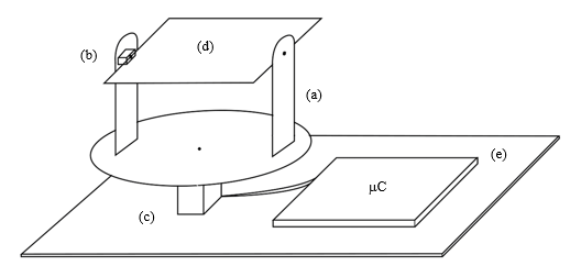 The construction of the solar sensor is shown in figure below. The setup consists of two servo motors (b) and (c), one of which (b) is mounted on the frame (a) to facilitate East-West movement of the organic photovoltaic (OPV) cell (d). The cell acts as a primary sensing device for the tracker. A servo motor (c) is mounted at the base which facilitates the North-South movement of the OPV cell. The cell is connected to the fork shaped frame (a) such that it can rotate about the horizontal axis when moved by the servo (b) and vertical axis when moved by the servo (c). The tracking algorithm of the sensor is controlled by a microcontroller (e).