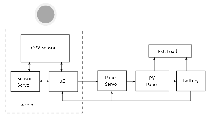The sensor is broadly divided into mechanical and electrical components, which are combined to form the solar tracking system. The mechanical structure comprises of the frame, whereas the electrical system consists of the motors, OPV cell and microcontroller. The block diagram shown in figure below gives an operational overview of various components used.