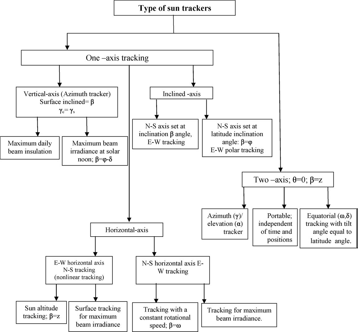 A more generic classification classifies them as one-axis and two-axis devices as illustrated in figure above. A detailed account of different solar tracking systems can be found in reviews [8, 35].